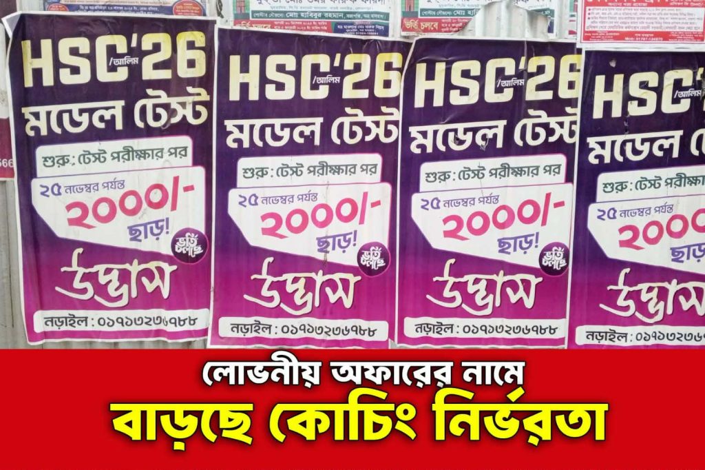 এসএসসি ও দালিখ পরীক্ষার সময় ঘনিয়ে এলে কোচিং সেন্টারগুলোর প্রতিযোগিতা যেন ভিন্ন মাত্রা নেয়। শহরের বিভিন্ন দেয়ালে সম্প্রতি চোখে পড়ছে “উদ্ভাস” নামের একটি কোচিং সেন্টারের আকর্ষণীয় পোস্টার “এসএসসি -২৬ মডেল টেস্ট”, “২০০০ টাকা ছাড়”, “টেস্ট পরীক্ষার পর শুরু” এমন নানা লোভনীয় বিজ্ঞাপন শিক্ষার্থী ও অভিভাবকদের দৃষ্টি কেড়েছে।