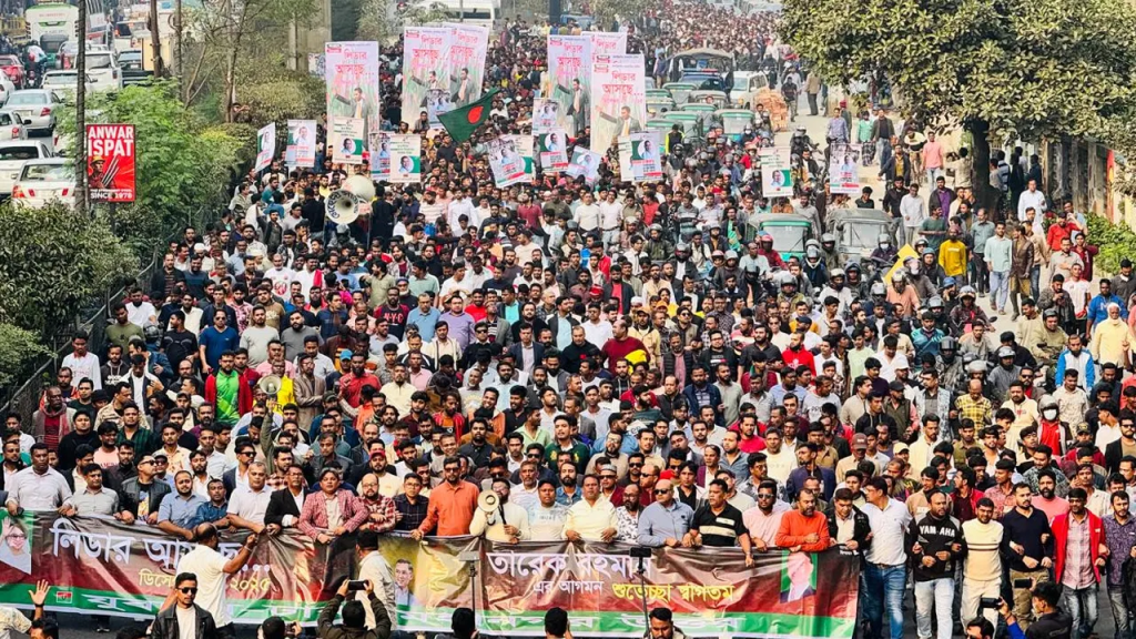 রোববার (২১ ডিসেম্বর) বনানীর কাকলি ফুটওভার ব্রিজের নিচ থেকে মিছিলটি শুরু হয়ে মহাখালী কাঁচাবাজারে গিয়ে শেষ হয়। দীর্ঘ ১৭ বছর পর আগামী ২৫ ডিসেম্বর লন্ডন থেকে দেশে ফিরছেন তারেক রহমান।