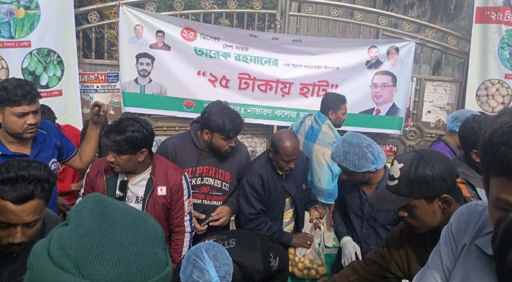 তারেক রহমানের স্বদেশ পত্যাবর্তন উপলক্ষে ছাত্রদলের উদ্যোগে “২৫ টাকায় হাট” কর্মসূচি পালন করা হয়। বৃহস্পতিবার সকাল ১১টার সময় নাভারণ কলেজ গেটের সামনে এই আয়োজন করা হয়। এই হাটে নাম মাত্র মূল্যে জনসাধারণের জন্য ২৫ টাকায় শতাধিক পরিবারের মাঝে সপ্তাহের নিত্যপ্রয়োজনীয় কাঁচা বাজার সরবারাহ করা হয়। স্বল্প মৃল্যে সপ্তাহের সবজি পেয়ে কৃতজ্ঞতা প্রকাশ করেন সাধারণ মানু