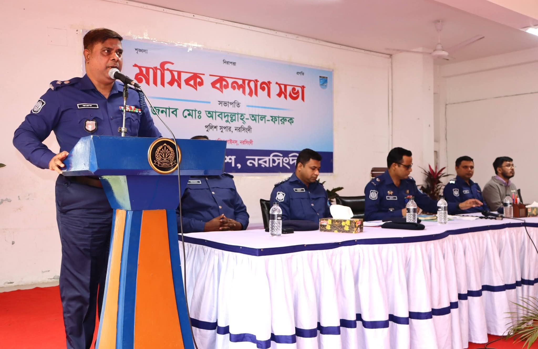 নরসিংদীতে অদ্য ২১ ডিসেম্বর ২০২৫ ইং রবিবার নরসিংদী পুলিশ লাইন্সে জেলা পুলিশ এর মাসিক কল্যাণ সভা অনুষ্ঠিত হয়েছে। নরসিংদী জেলা পুলিশ সুপার মোঃ আবদুল্লাহ্ আল ফারুক এর সভাপতিত্বে উক্ত সভায় বিভিন্ন পদবীর পুলিশ সদস্যগণ বক্তব্য রাখেন। পুলিশ সুপার তাদের কথা মনোযোগ দিয়ে শুনেন এবং বিভিন্ন সমস্যা সমাধান এর নিমিত্তে তাৎক্ষণিক সিদ্ধান্ত প্রদান করেন। পুলিশ সুপার সকলকে সততা,আন্তরিকতা ও সর্বোচ্চ পেশাদারিত্ব এবং নিরপেক্ষতার সাথে দায়িত্ব পালন এর জন্য আহবান জানান। সভায় নভেম্বর/২০২৫ ইং মাসের কর্মমূল্যায়ন এর স্বীকৃতি স্বরূপ অফিসার ও ফোর্সদের নগদ অর্থ সম্মাননা স্মারক ও সার্টিফিকেট বিতরণ করেন পুলিশ সুপার। এছাড়া পুলিশ সুপার এর সম্মেলন কক্ষে জেলা পুলিশ এর নভেম্বর/২০২৫ ইং মাসের মাসিক অপরাধ পর্যালোচনা সভা অনুষ্ঠিত হয়েছে। সভায় জেলার আইন শৃঙ্খলা পরিস্থিতি ও সামগ্রিক বিষয়াদি নিয়ে আলোকপাত করা হয়।উক্ত সভায় জেলা পুলিশ এর ঊর্ধ্বতন কর্মকর্তাগণসহ সকল ইউনিট এর ইনচার্জগণ এবং বিভিন্ন পদবীর পুলিশ সদস্যগণ অংশগ্রহণ করেন।