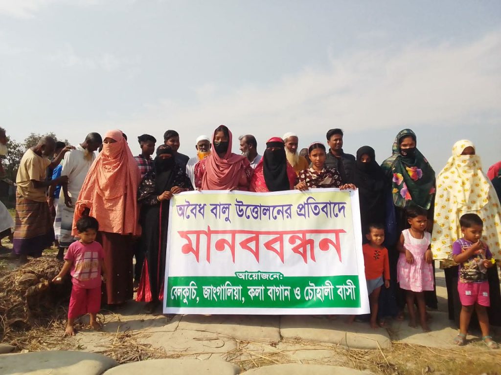 বেলকুচিতে যমুনার চরে অবৈধ বালু উত্তোলন ভাঙনে শঙ্কায় এলাকাবাসী, মানববন্ধন