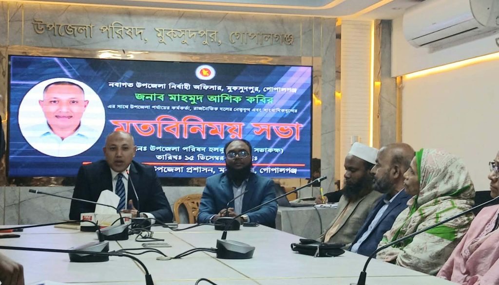 গোপালগঞ্জের মুকসুদপুর উপজেলায় নবাগত নির্বাহী অফিসার (ইউএনও) মাহমুদ আশিক কবিরের মতবিনিময় সভা অনুষ্ঠিত হয়েছে।