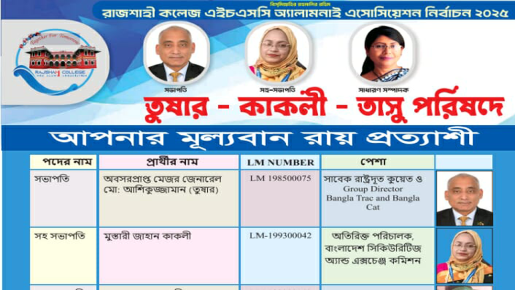 ফলে কার্যনির্বাহী কমিটির প্রতিটি পদে মনোনয়ন দেওয়া হয়েছে ‘যোগ্যতা ও কাজের বাস্তব প্রয়োজনে’—যা এই প্যানেলকে অন্যদের থেকে স্পষ্টভাবে আলাদা করেছে। প্যানেল ক আরও বলেছেন, “আপনি যদি রাজশাহী কলেজের এলামনাই অ্যাসোসিয়েশনকে সত্যিই এগিয়ে নিয়ে যেতে চান, তাহলে আবেগের সঙ্গে বাস্তবতার সমন্বয় করে ‘কার্যনির্বাহী পরিষদ’ নির্বাচনে বিবেচনা করবেন।” তারা ভোটারদের চিন্তাশীল সিদ্ধান্ত নেয়া এবং প্যানেলের কাজে সমর্থন কামনা করেছে।