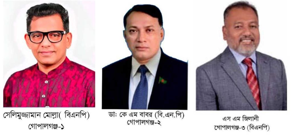 এবারের ত্রয়োদশ সংসদ নির্বাচনে বিএনপির তিনটি আসনেই জয় পেল বিএনপি। গোপালগঞ্জ-১ আসনে (সংসদীয় আসন ২১৫) বিএনপি মনোনীত সেলিমুজ্জামান মোল্যা, গোপালগঞ্জ-২ আসনে (সংসদীয় আসন ২১৬) বিএনপি মনোনীত কে এম বাবর এবং গোপালগঞ্জ-৩ আসনে (সংসদীয় আসন ২১৭) বিএনপি মনোনীত এস এম জিলানী বেসরকারি ভাবে বিজয়ী হয়েছেন।