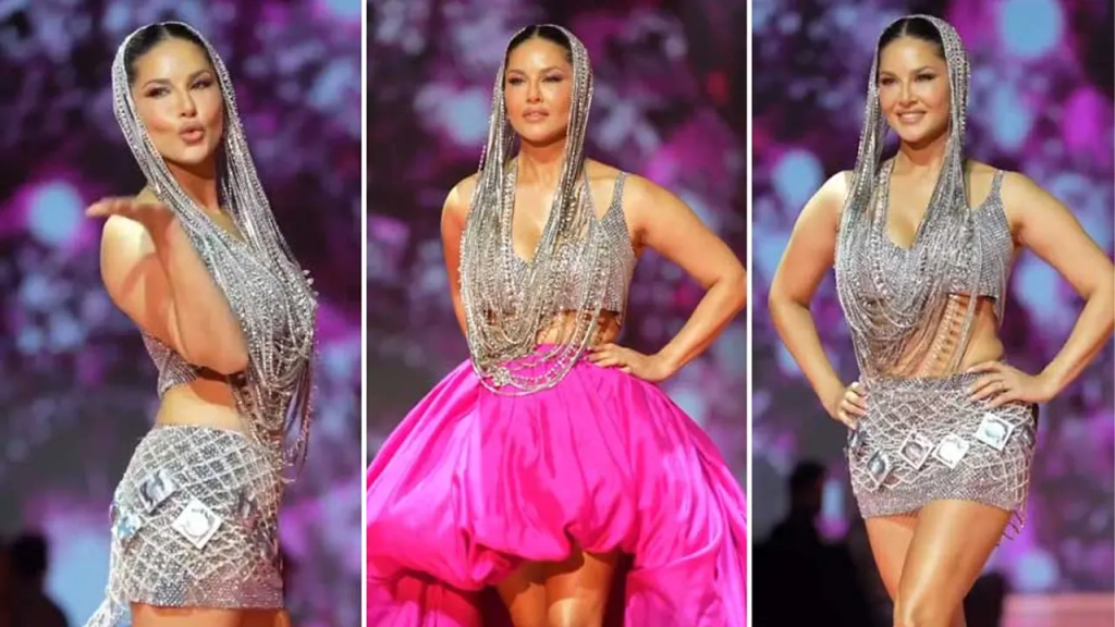 ভারতীয় মিডিয়ার খবর অনুযায়ী, ক্রিস্টালখচিত সিলভার পোশাকের সঙ্গে গোলাপি মিনি ওভারস্কার্ট পরে র‍্যাম্পে প্রবেশ করেছিলেন সানি। মঞ্চে এগিয়ে আসার সঙ্গে সঙ্গে তিনি ওভারস্কার্টটি সরিয়ে দেন এবং পুরোপুরি ক্রিস্টাল দ্বারা তৈরি রূপালি পোশাকে ধরা দেন। কিন্তু চমক সেখানে শেষ হয়নি—স্কার্টে ঝুলছিল সারি সারি কনডমের প্যাকেট। দর্শকরা একেবারে স্তম্ভিত।