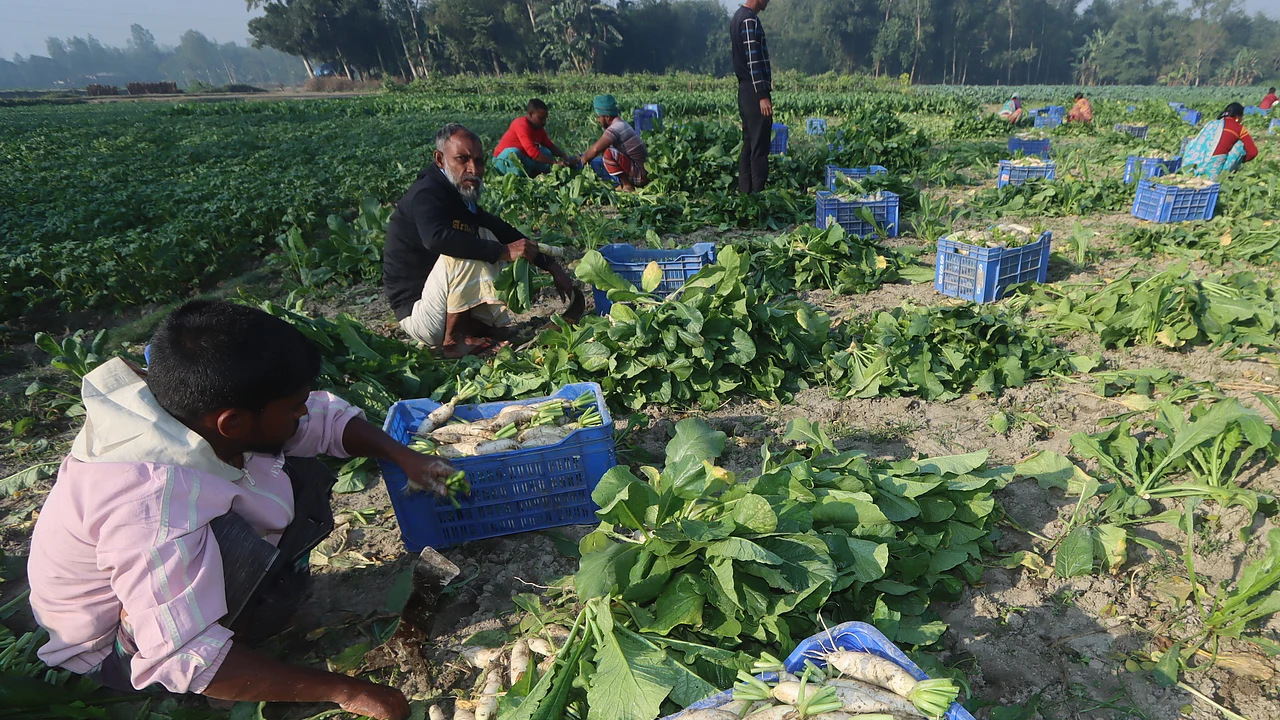 ভোরে খেতের মুলা তুলে পাইকারের কাছে বিক্রি করছেন চাষি।